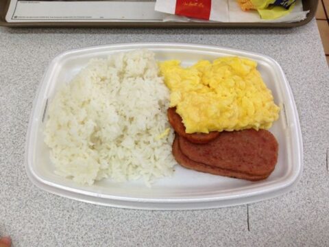ローカルプレートで、スクランブルエッグにスパムソーセージに米!?
