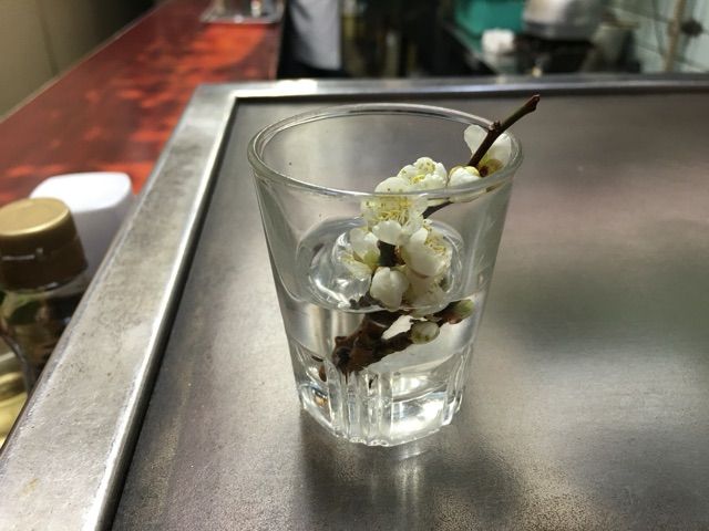 グラスに活けられた梅の花に癒されます。