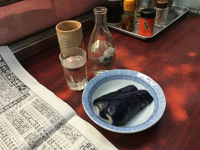 熱燗にナスぬか漬け。