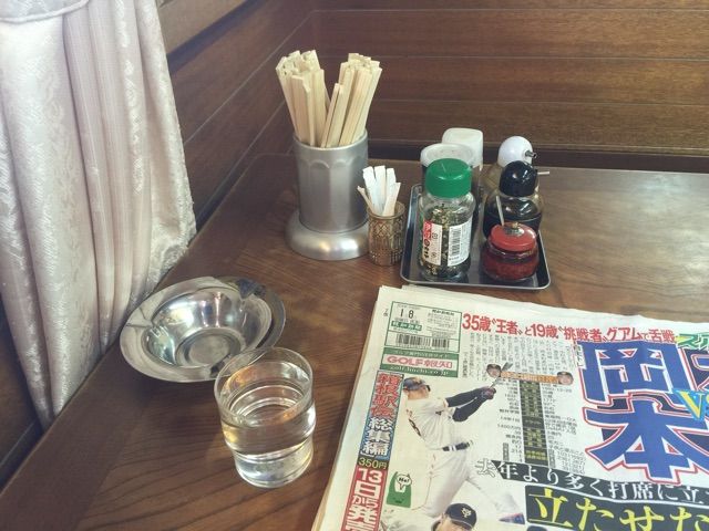 テーブル基本調味にふりかけ、さらにには灰皿とスポーツ新聞。
