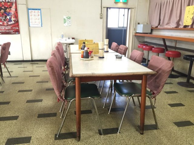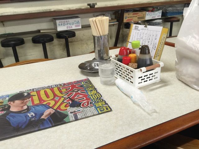 スポーツ新聞に灰皿、基本調味料いっぱいが市場の食堂のデフォルト。
