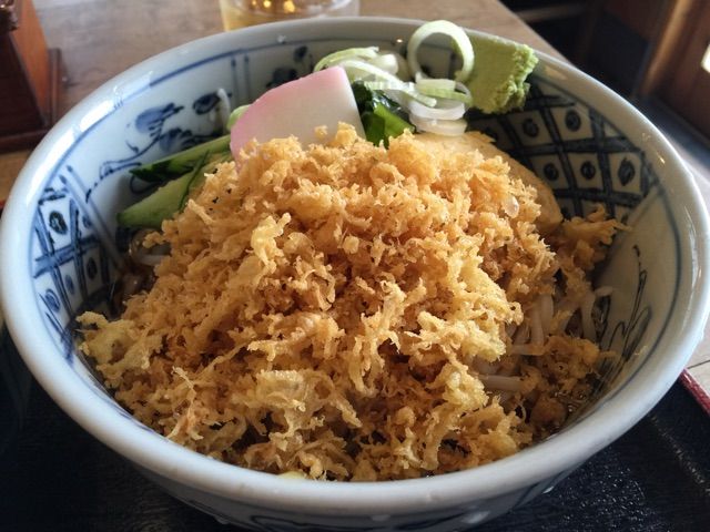 天かすで蕎麦が見えません。具は天かすにきゅうりにかまぼこ、卵焼きに刻みネギ。