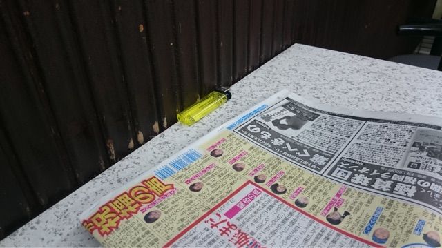 テーブルの上にはスポーツ新聞とライターのみ。