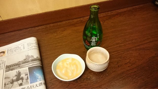 お酒にお通しの塩辛、そして新聞が出てきて準備完了。