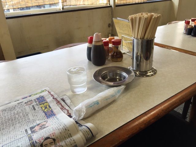 スポーツ新聞に灰皿があり準備万端です。