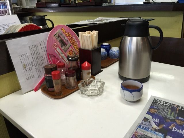 テーブルには基本調味料たくさんに灰皿にスポーツ新聞。