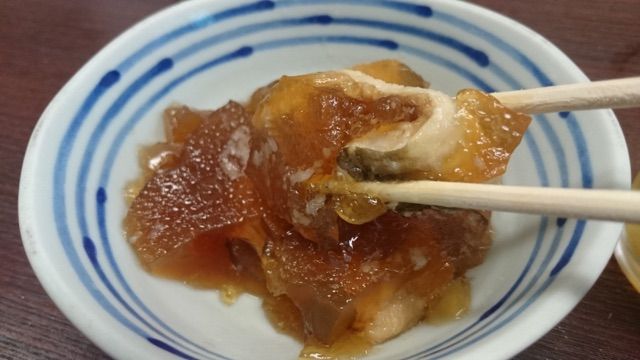 ひんやり、プルンとした舌触りに、喉に流れ込むすっきりした甘さ、鼻をくすぐる香ばしさが大人の煮凝りって感じで旨いですね。