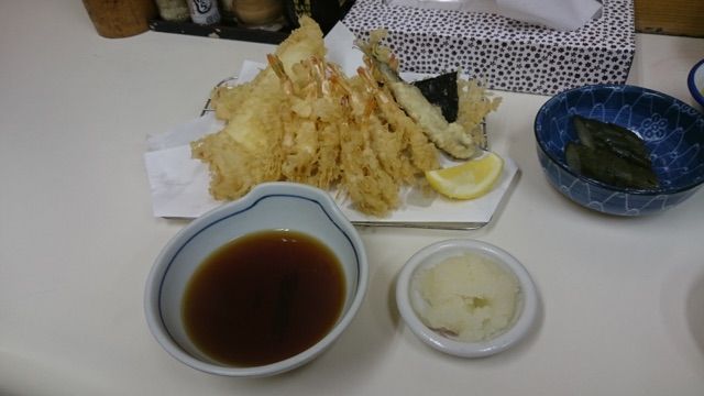 市場でまぐろブツ、稚鮎、芝エビ、ヤリイカ天@天房 (築地場内市場)