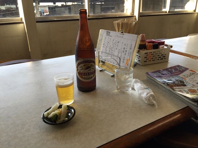 やっちゃ場を見下ろしながらビールをいただきます。