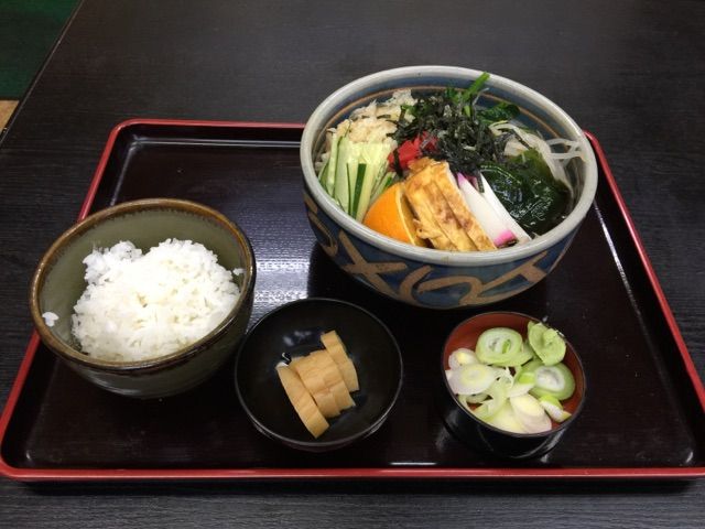本日は冷やしたぬきそば。ランチタイムだったので小ごはんが付きました。