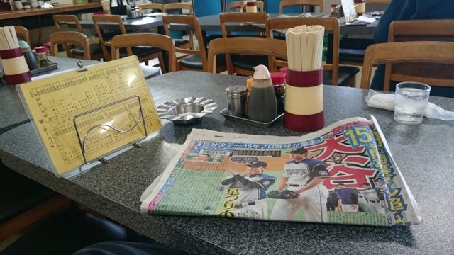 テーブルには基本調味料と灰皿とスポーツ新聞。