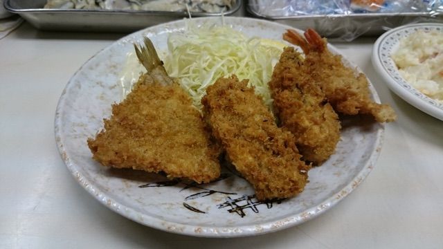 市場でミックスフライ&ラーメン@食堂かつや(柳橋中央市場、愛知県名古屋市中村区名駅)