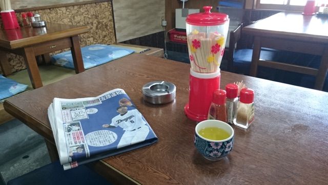 机上には、基本調味料に灰皿にスポーツ新聞。