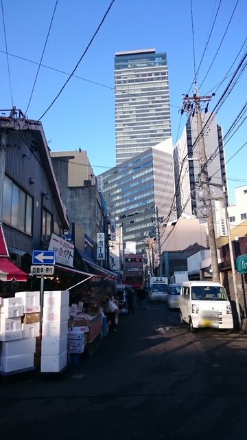 昭和の色を残す柳橋中央市場から見る近代的なビル。