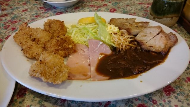 ホタテフライにポークチョップ、ハヤシもかけてあります。