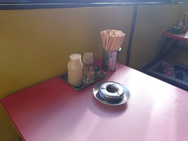 テーブルにはゴマ、胡椒、餃子のたれ、ニンニク、ラー油、灰皿はマストアイテムである。