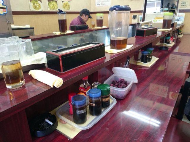 この字型カウンター、調味料がたっくさんあり、漬物はセルフで取り放題。