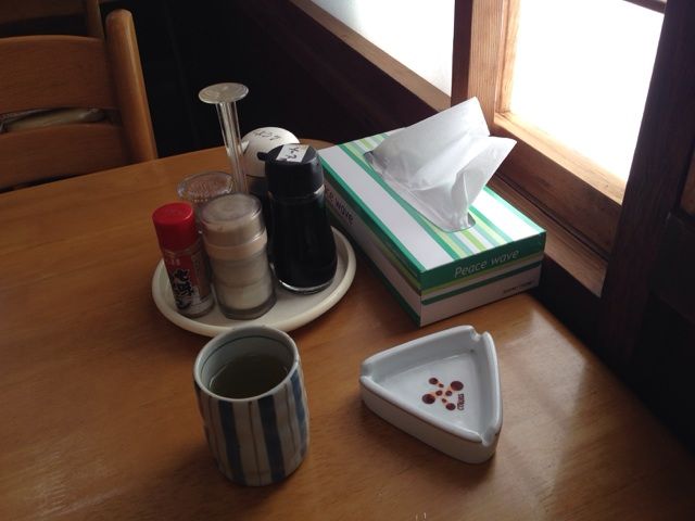 暖かいお茶に灰皿がまたいい感じである。