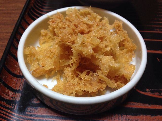 うどん全てについてくる天かすをいれるとコクがさらにまして、うまいうまいものになる。
