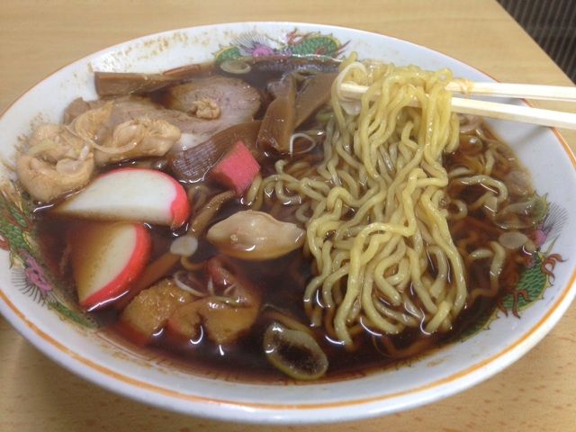 チャーシューにかまぼこ、シナチクに麸、さらに鶏肉まで入ったサービス精神旺盛な中華そば。麺のゆで方もいい。スープは色目からすると拍子抜けするほどさっぱりとした味。これはきしめんを頼めば相当楽しめそうである。