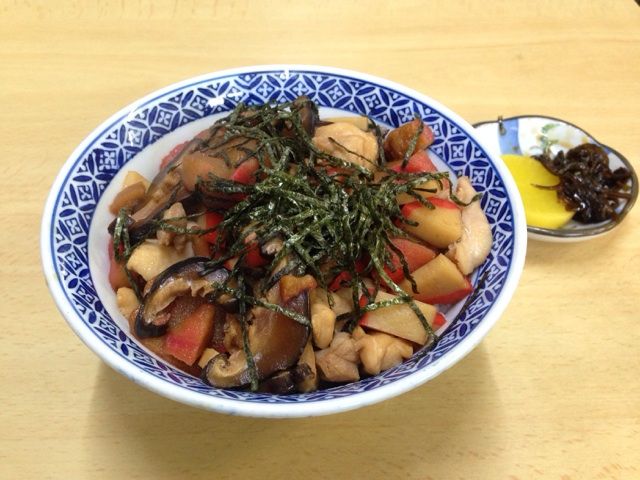 鶏肉、かまぼこ、椎茸、麸が入り刻み海苔まで散らしてあるビジュアルの良い木の葉丼である。