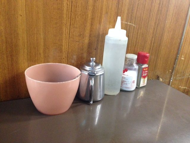 テーブルには砂糖、ミルク、ガムシロップに塩、胡椒。