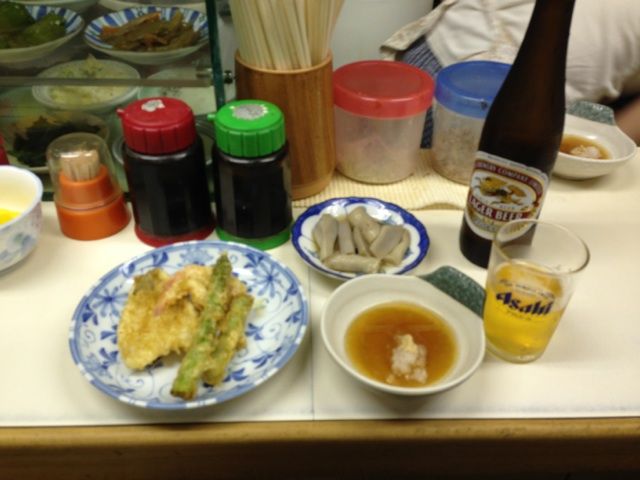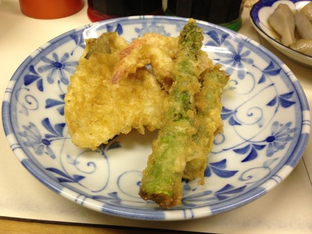 アスパラの天ぷら。その後ろは鱚に赤車エビである。