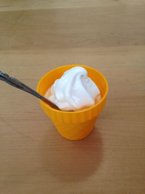 「お子さんにソフトクリームでもどう?うちのは水が入ってないからすぐ溶けちゃうけど美味しいよ。」