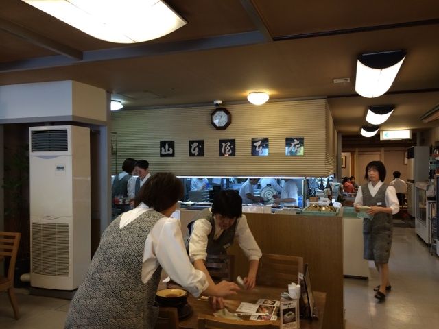 店内こんな感じ、厨房を中心にぐるっと客席が並ぶ、手前はテーブルで、奥は座敷である。