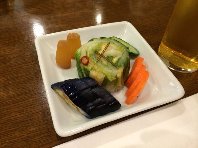 テーブルに着くとおしぼり、割り箸、お茶に紙エプロンが出されます。
