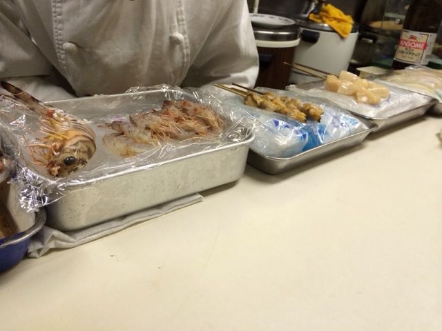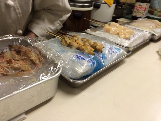 分かりにくいですが、右からホタテ、あさり×2、アカシャエビ、イカ。