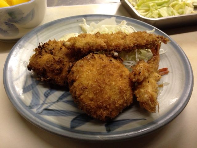 時計回りに上からあさり、アカシャエビ、アカシャエビのクリームコロッケ×2。