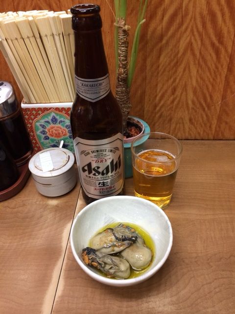 とりあえず牡蠣のオイル漬けにビール。