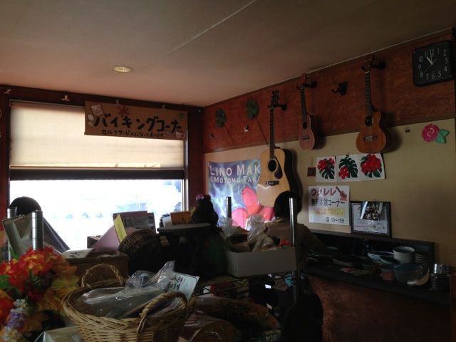 ウクレレやサーフィンボードなどが壁に掛けられていてちょっとハワイアン!?