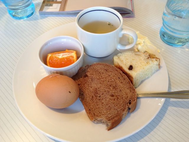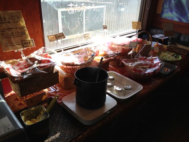 トッピング、シロップは別売りなので、ビンボー症の私はバイキングメニューのマーガリンを塗りたくって頂く。