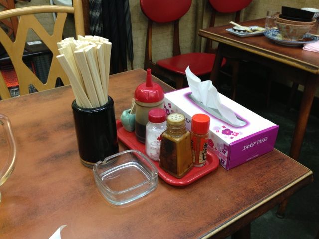 テーブルの上には基本調味料と灰皿。ティッシュがあるのが嬉しい。