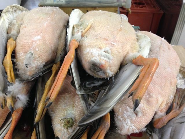 かもは軒下に吊るしておいて熟成させるってのは聞いたことがあります。内蔵が程よく腐った物が美味しいそうで、お尻の穴のカビ具合で確かめるってのも聞いたことがあります。