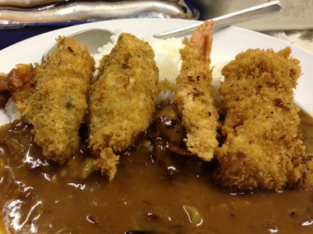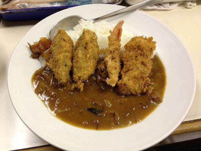 本日もシーフードフライカレー。牡蠣×2、アカシャエビ、ホタテ。