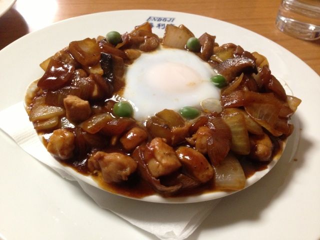 さっぱりしたデミグラスソースで鳥肉、玉ねぎ、椎茸を和えて、生卵を落とし加熱してある感じです。