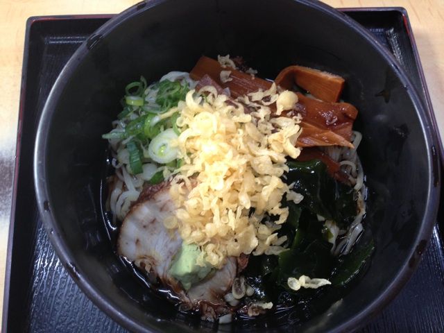 うどんの出汁ベースのたれ、シナチク、ねぎに若芽、そして天かす。