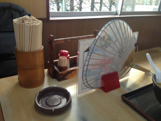 机の上はシンプルな調味料に灰皿、そして団扇!!??