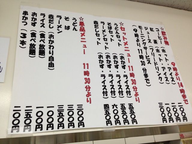わかりにくいですが、ご飯お代わり自由が100円、おかずお代り自由が250円、味噌汁お代り自由が100円
