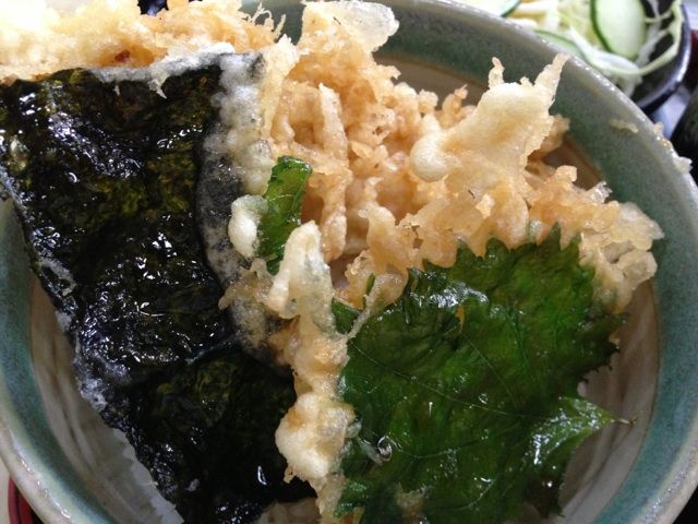 天丼が…。今はやりのつゆだくで…、具は紫蘇の葉に海苔に海老…。ちょっとご飯が進む感じではない…。