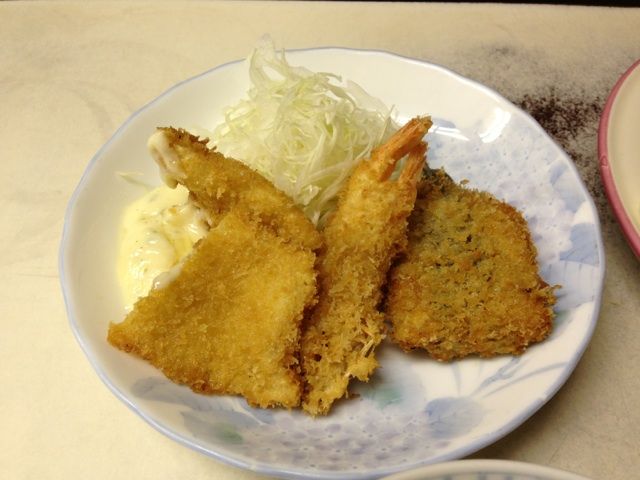 とりあえずアカシャエビとイカとイワシをフライでつまみます。
