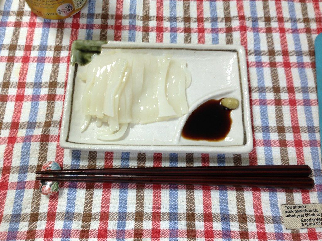 基本イカ刺し。美味しいところだけとって刺身にする。ねっとりと甘い感覚がイカの魅力である。まあもっと新鮮だと、シャキっとしているのだが…。