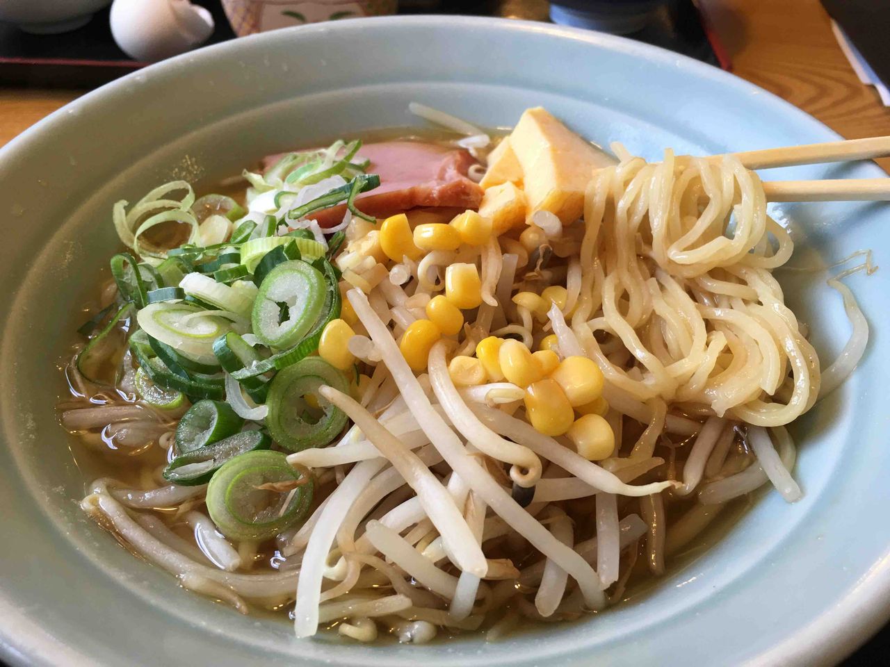 チャーシューに卵焼き、コーンが入ったカオスな一杯。