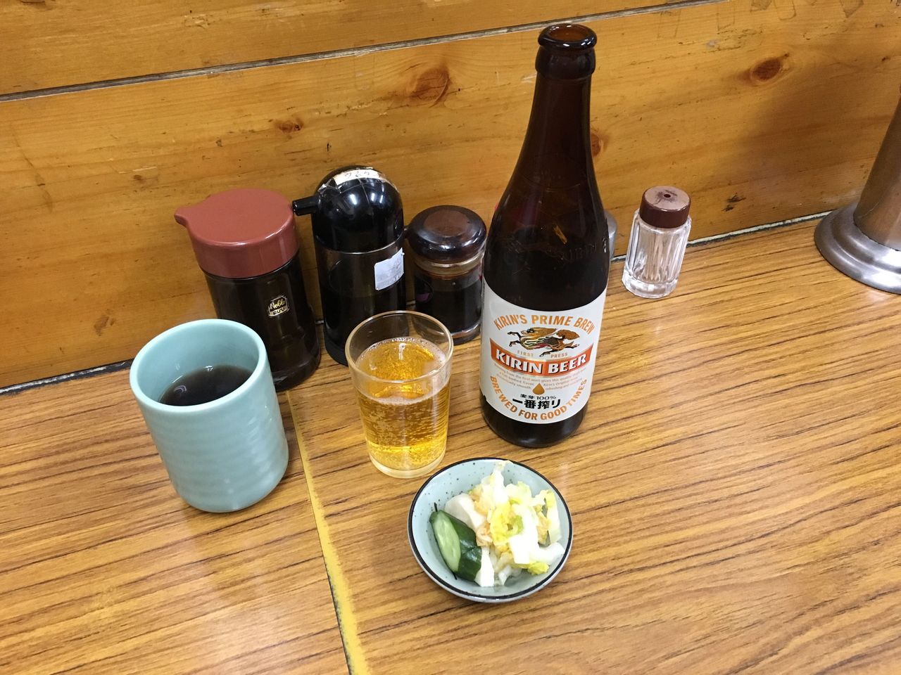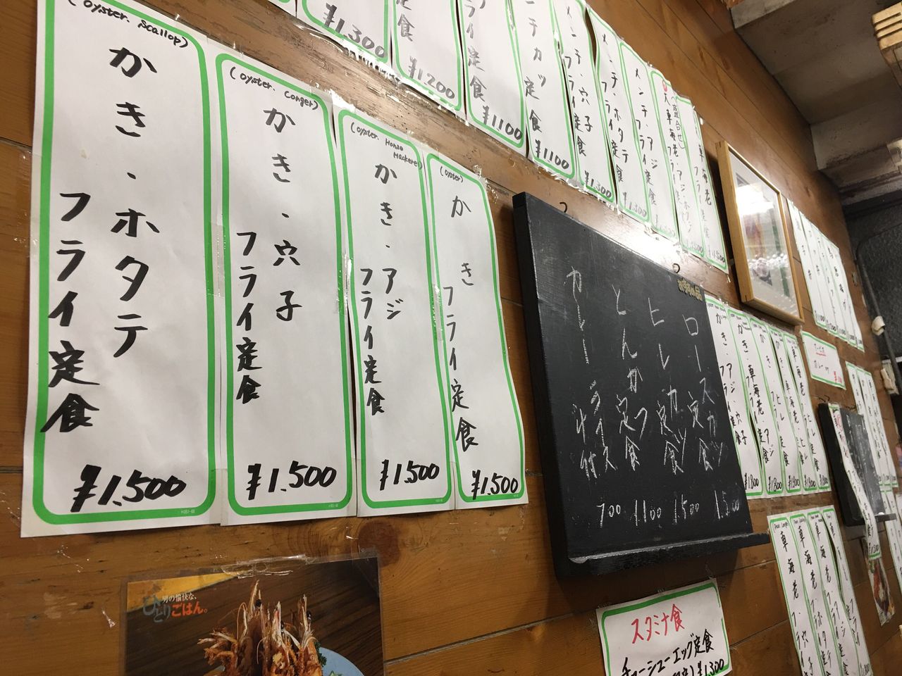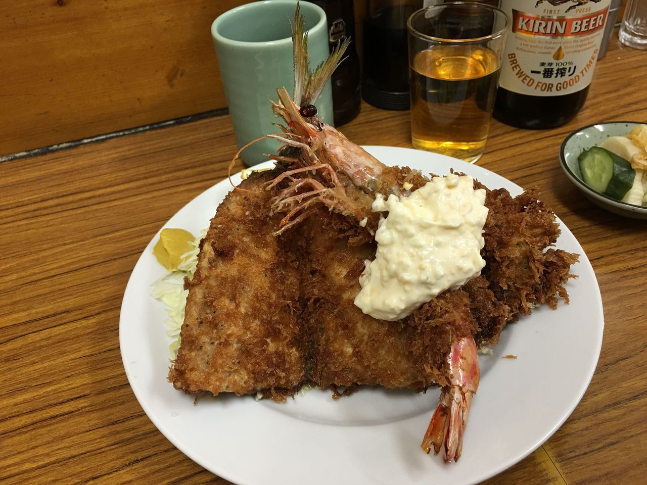 どうしようかと壁に張り巡らされたメニューを眺め、かき・車海老・アジフライの単品にビールをお願いします。