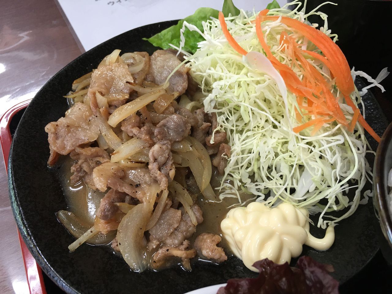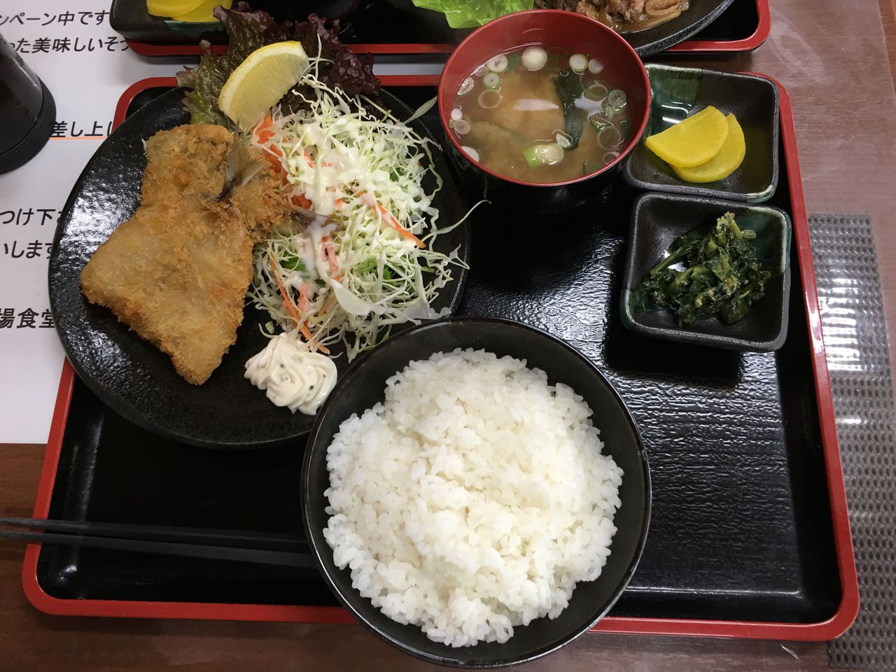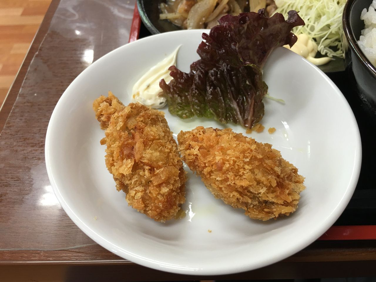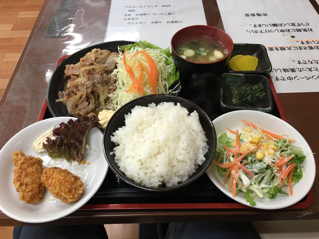 私は昼過ぎに来たので市場食堂で生姜焼き定食カキフライトッピング。