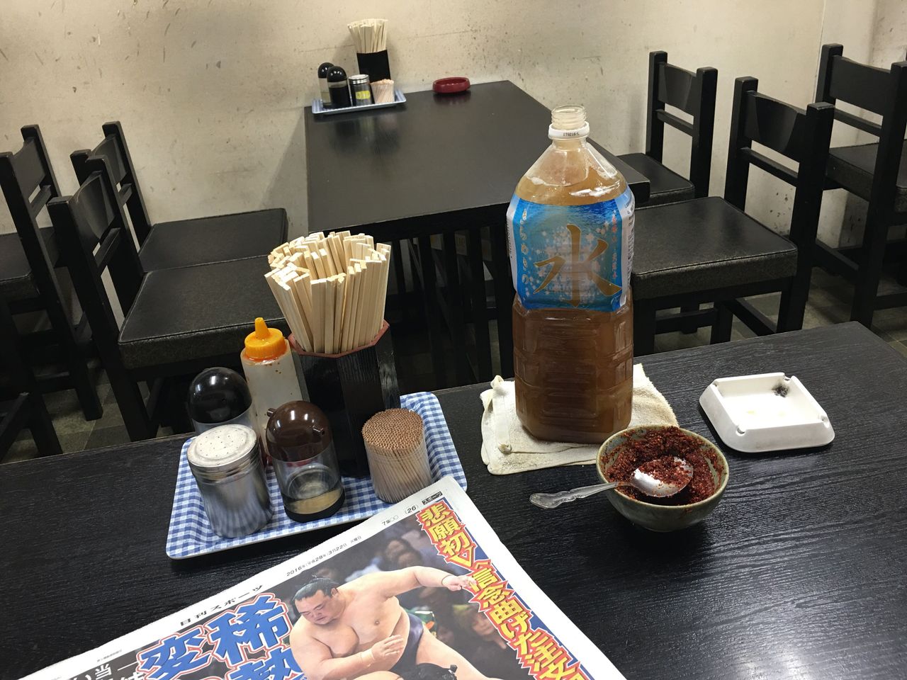 店内テーブルのみ。テーブルの上には基本調味料とスポーツ新聞、灰皿が完備されています。