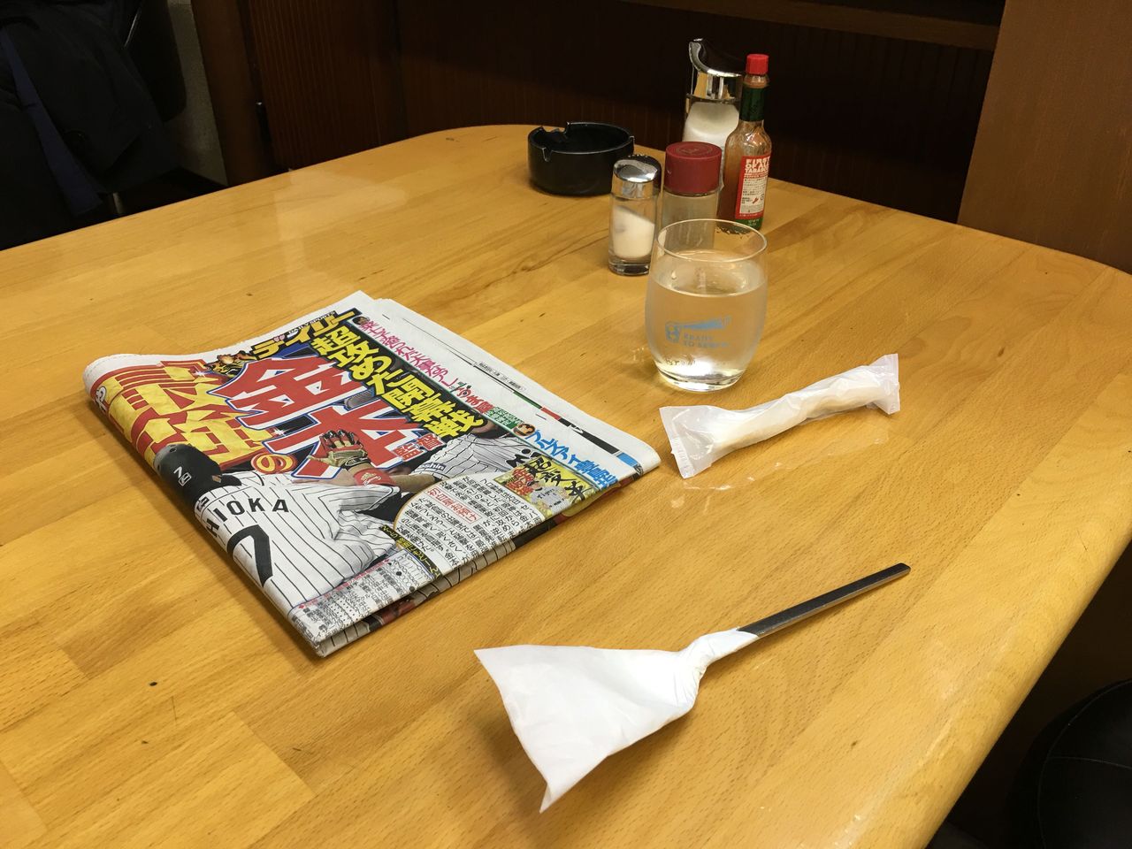 テーブルにスポーツ新聞と灰皿はマストアイテムである。